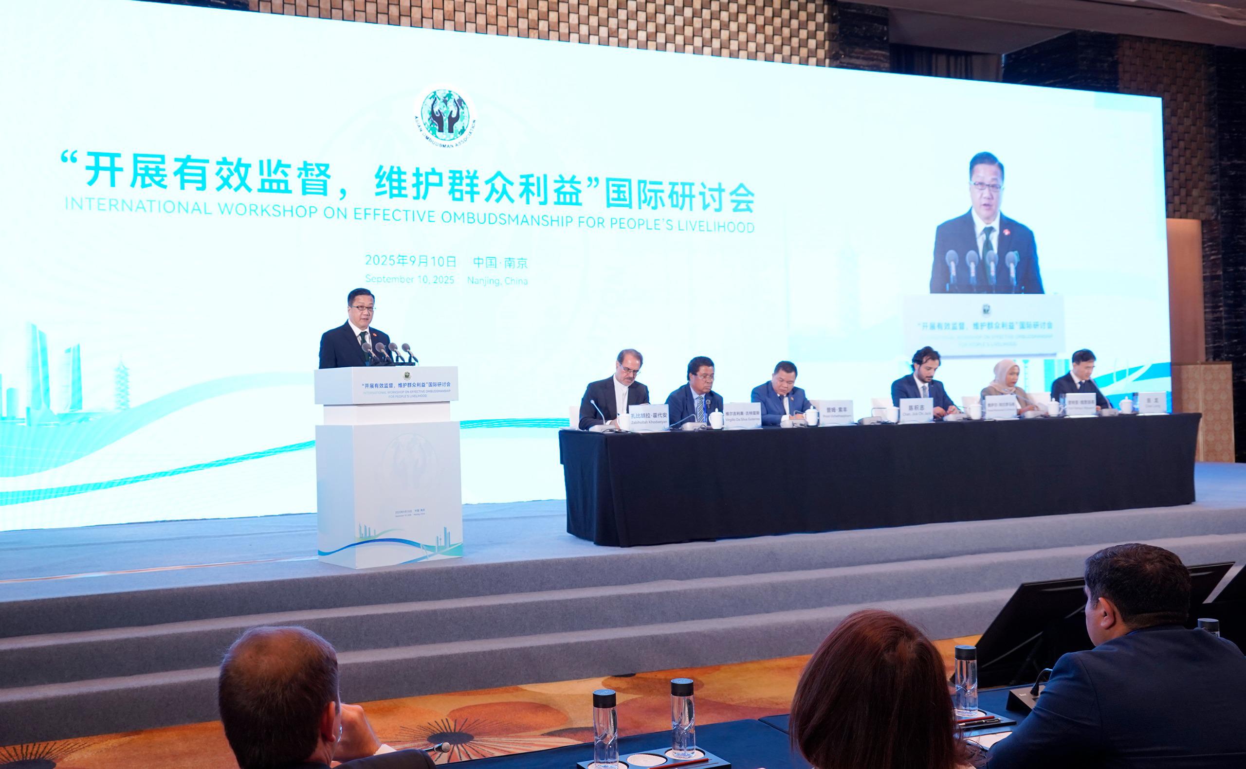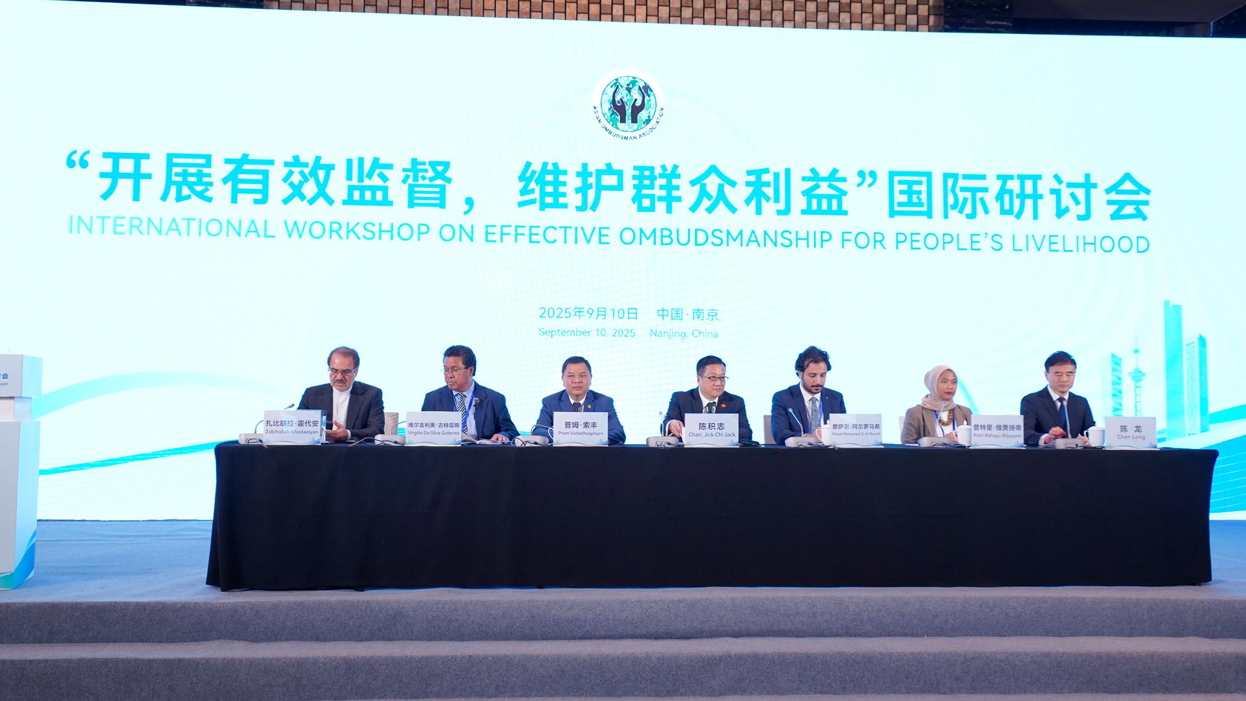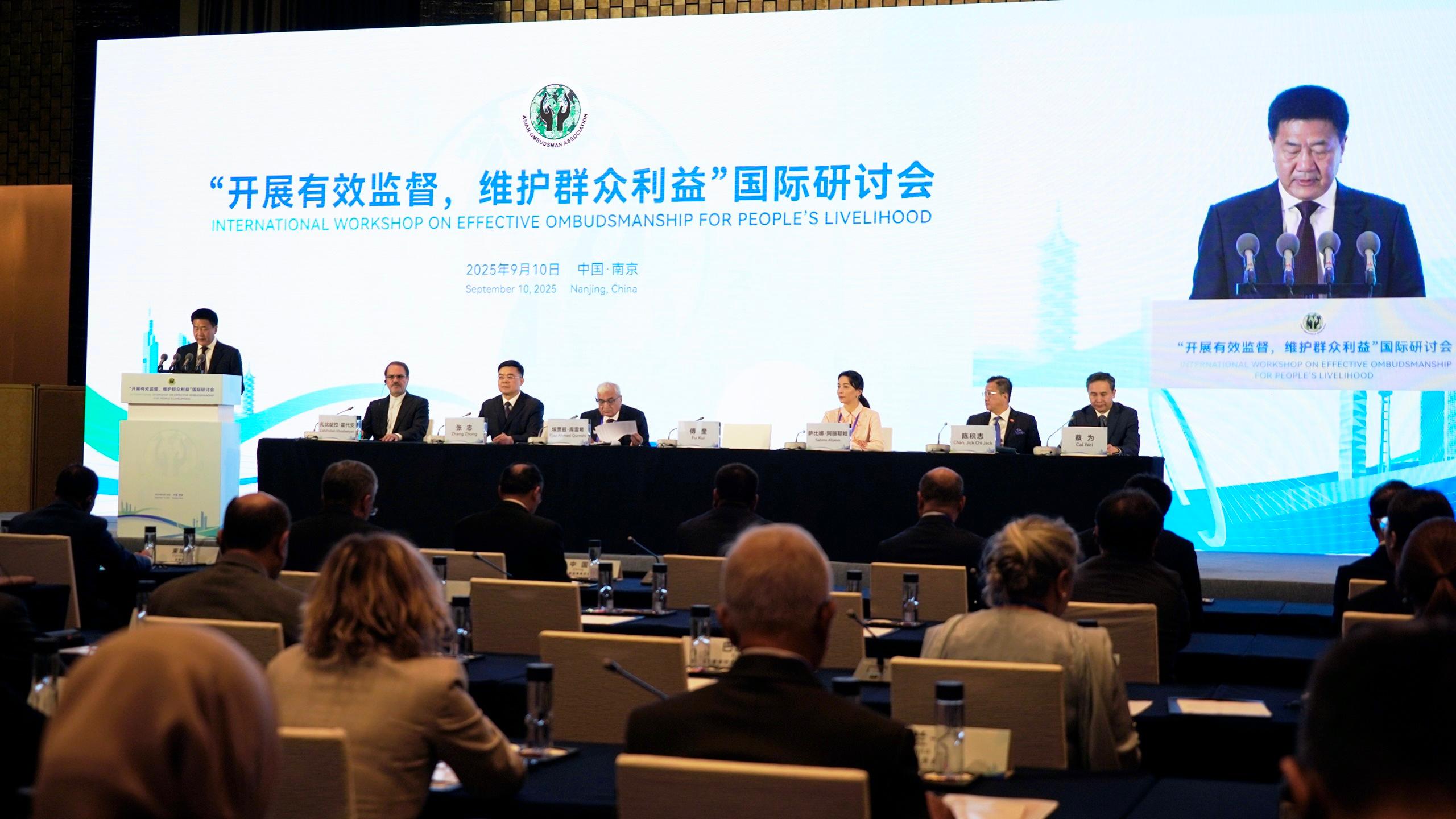 亞洲監察專員協會於今日(9月10日)舉行以「開展有效監督,維護群眾利益」為主題的國際研討會。申訴專員陳積志擔任主禮嘉賓之一,與中共中央紀律檢查委員會副書記、國家監察委員會副主任傅奎、協會主席Ejaz Ahmad Qureshi、江蘇省監察委員會主任張忠、國家監察委員會國際合作局局長蔡為、協會副主席Sabina Aliyeva及司庫Zabihollah Khodaeiyan一同主持研討會開幕儀式。