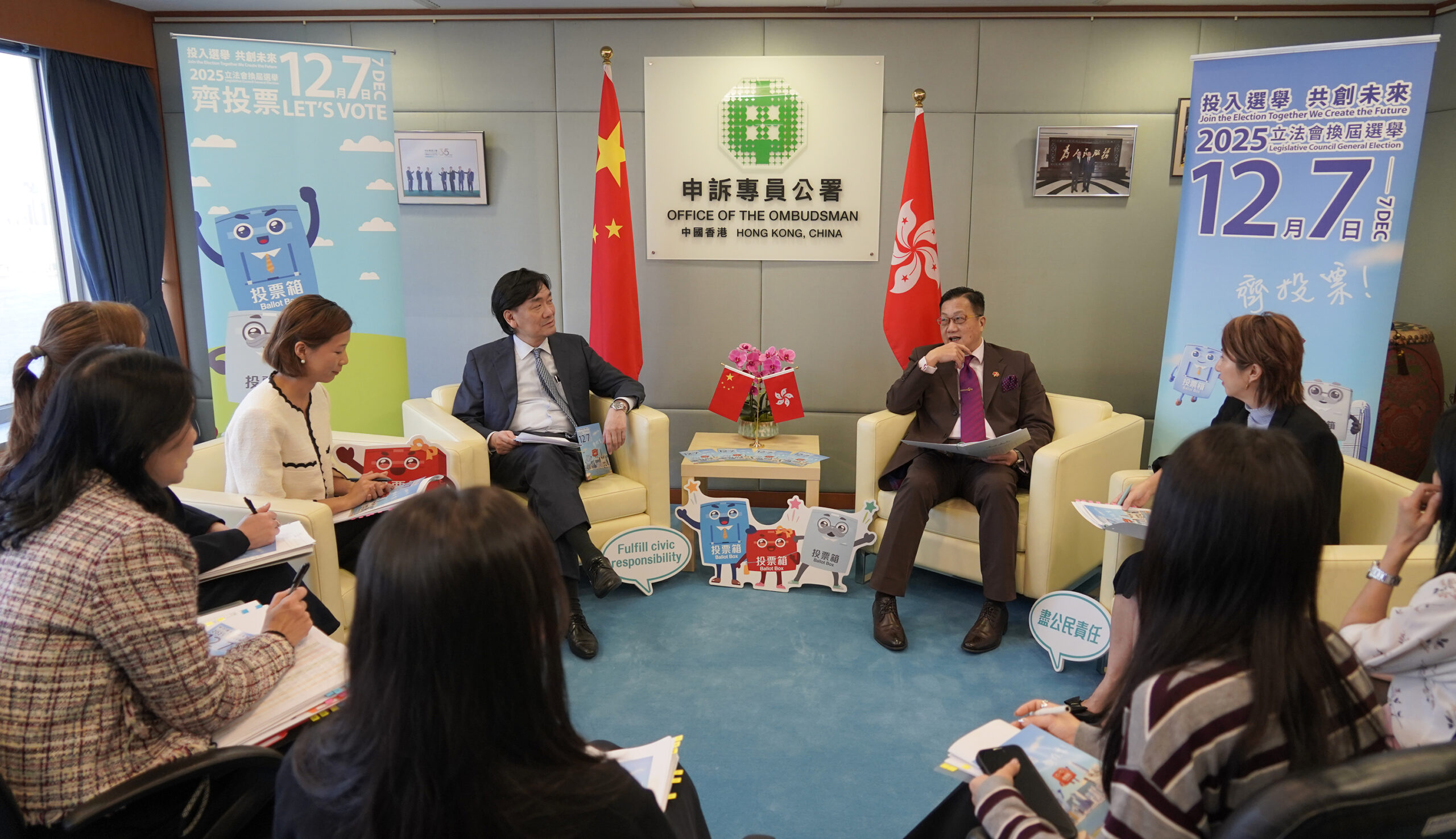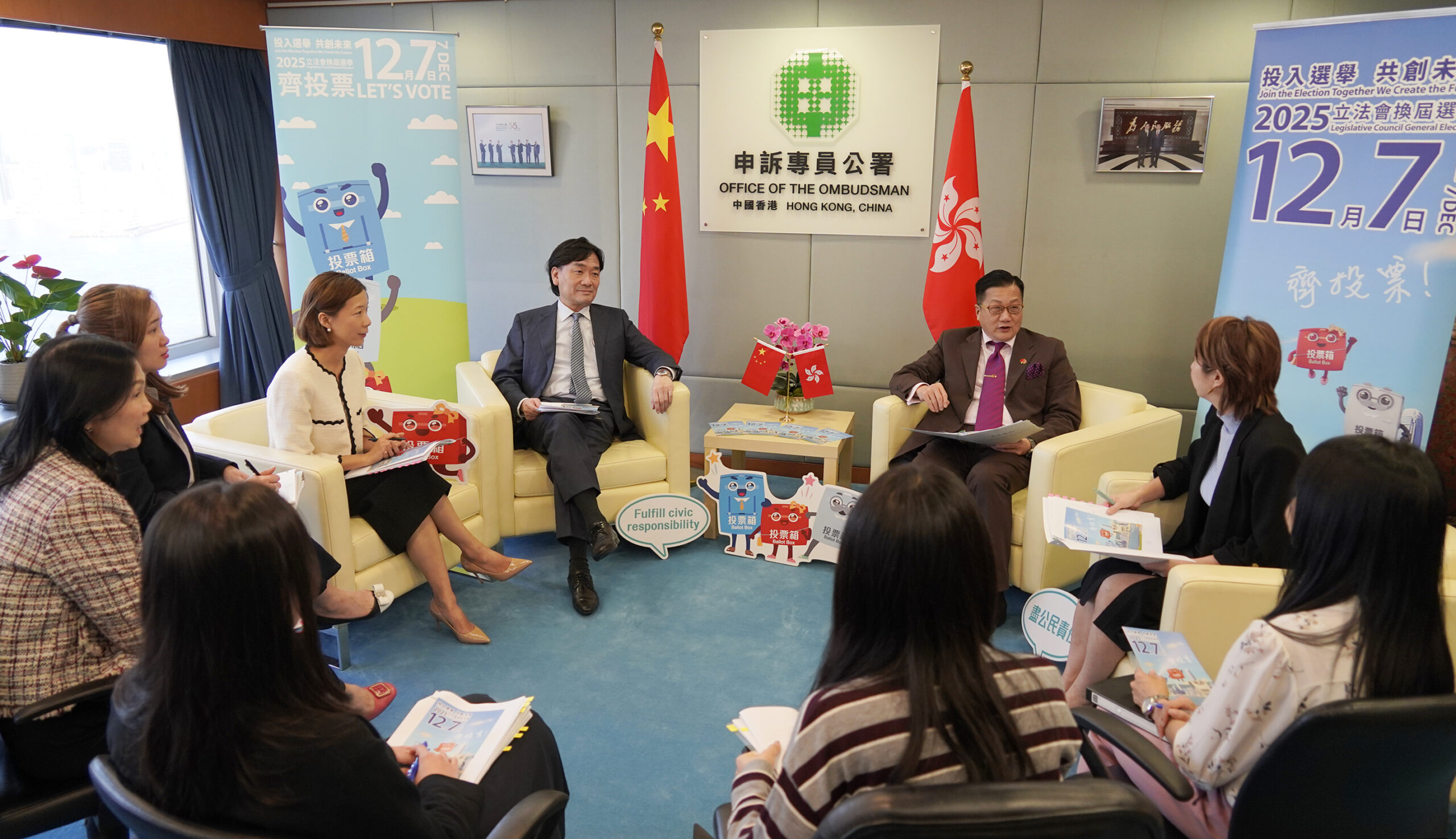 由申訴專員陳積志領導的選舉專班今日(11月17日)再度召開會議,特別商討將於明日(11月18日)舉行的「申訴專員嘉許獎頒獎典禮」上,加强立法會選舉的宣傳工作,包括在會場內外擺放選舉宣傳單張及宣傳品,設有拍照專區及選舉小道具,鼓勵在場的公職人員及其親友積極投入立法會選舉,踴躍投票。