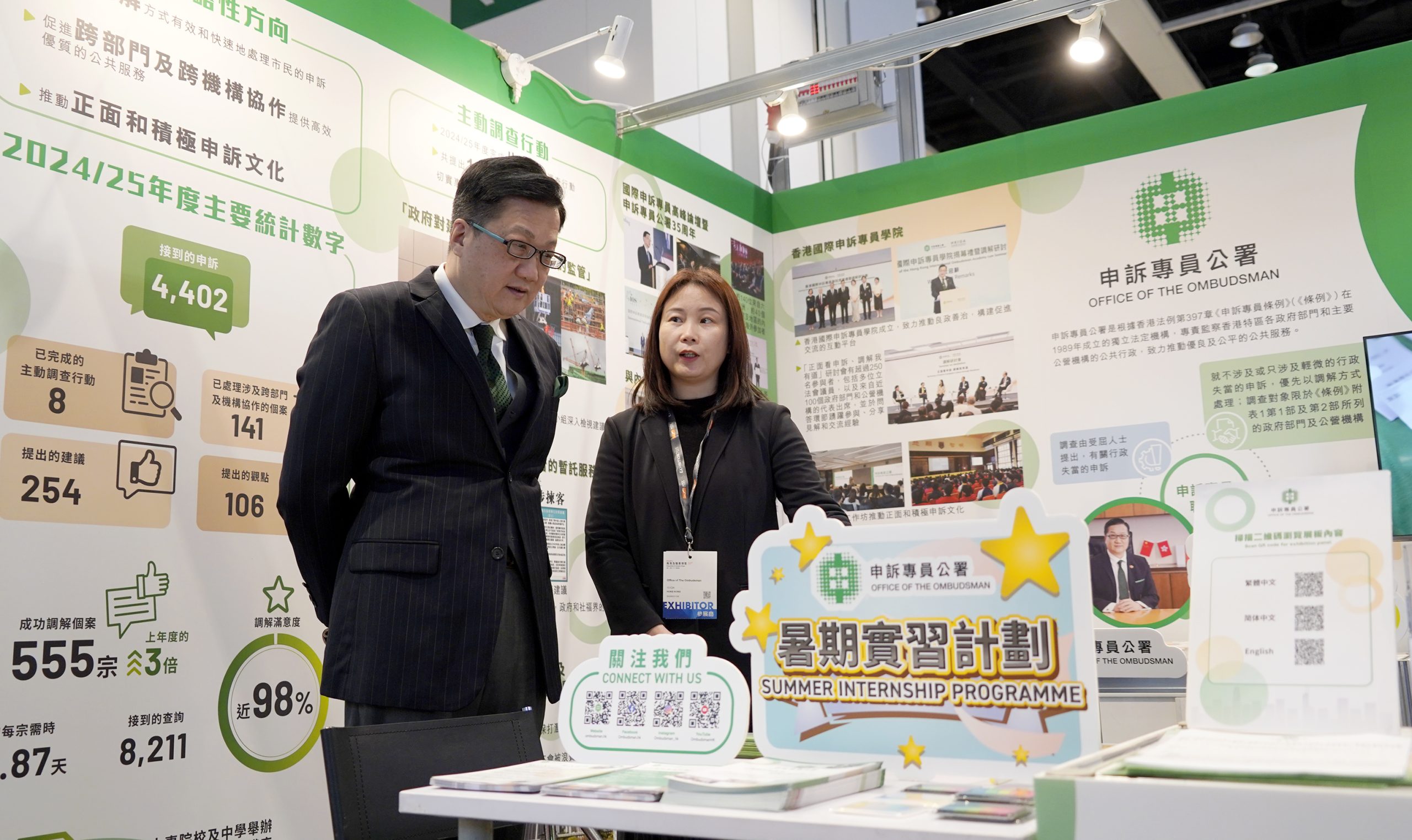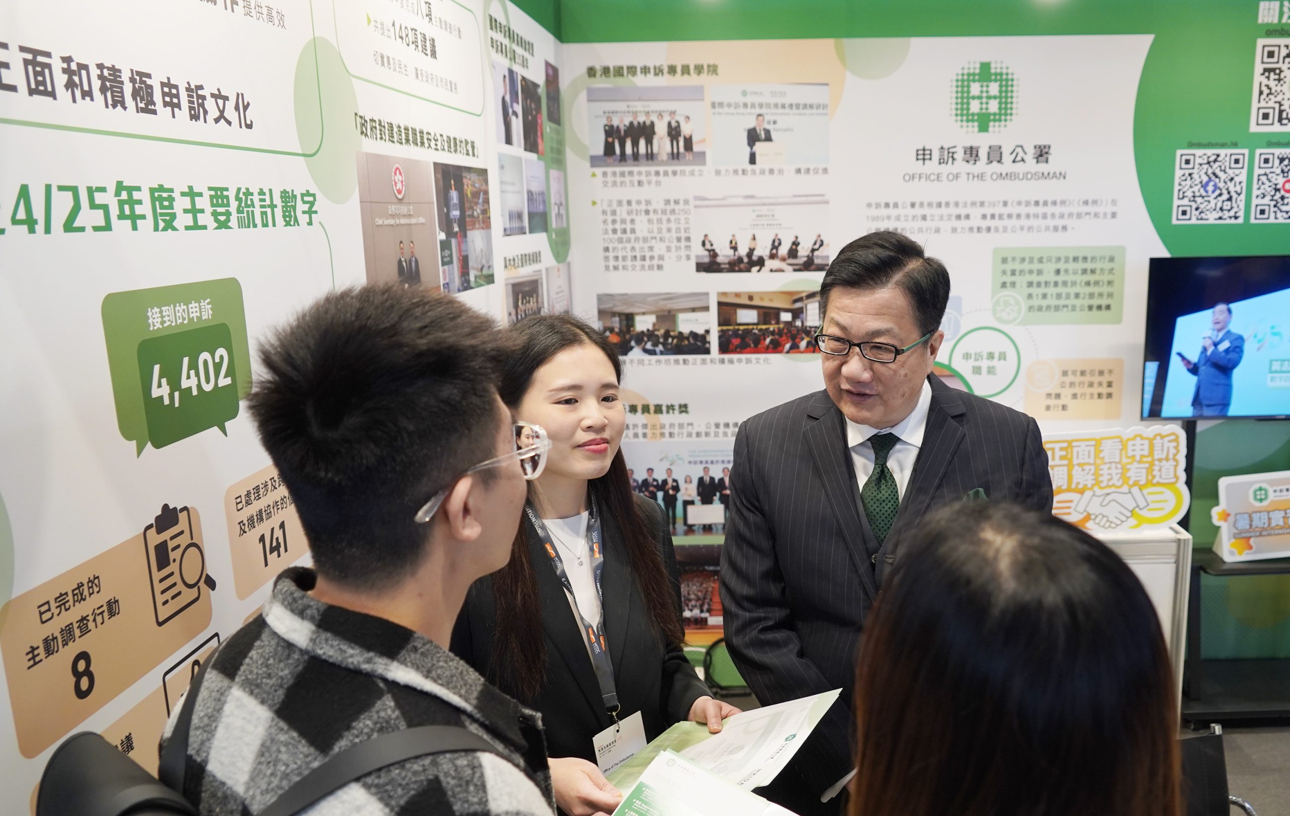 申訴專員陳積志聯同公署首長級人員親臨會場參觀展位,並與參觀人士及求職者交流。他表示:「公平及高效的公共行政是社會穩健發展的重要基石。公署專責監察香港的公共行政,希望鼓勵更多年輕人積極參與公共事務,了解良政善治的重要性,推動正面申訴文化,共同建設更美好、更優質的社會,為國家及香港的發展作貢獻。」