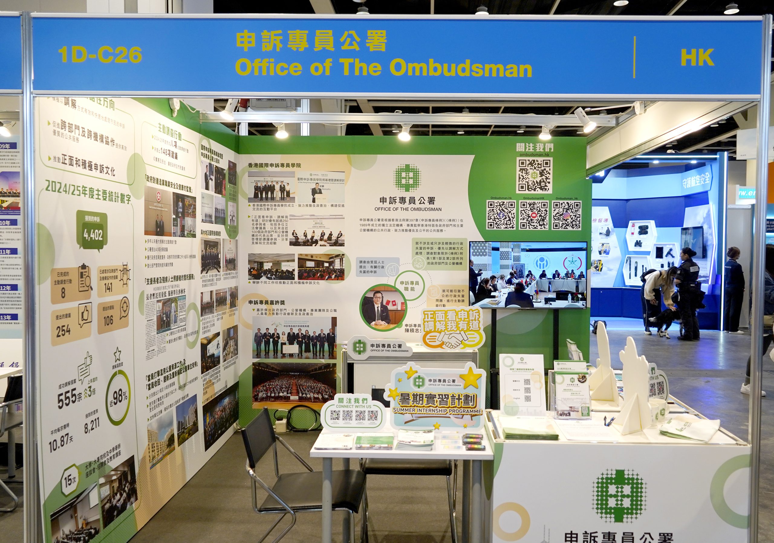 公署展位內容豐富多元,除了介紹公署的職能及申訴專員的三大策略性方向外,亦透過上年度主要統計數字、重點主動調查行動、香港國際申訴專員學院的成立及各類工作成果,全方位展示公署在促進良好公共行政及推動正面申訴文化的努力和成效。參觀人士反應熱烈,踴躍與公署職員互動交流,了解不同職位的要求、發展前景及工作體驗。