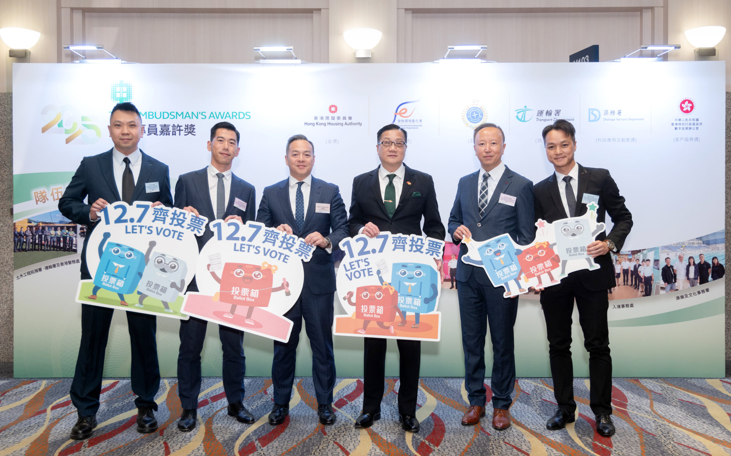 陈专员不仅在致辞中呼吁大家履行公民责任于投票日踊跃投票,更身体力行与到场的政府部门及公营机构首长、公职人员一同手持选举小道具合照打卡,同心协力宣传选举,鼓励全港选民积极参与投票,共同为香港的未来出一分力。